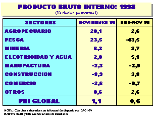 La Pesca registra un comportamiento negativo, (-43,5%), respecto a enero-noviembre de 1997, por los efectos del fenómeno de El Niño, aunque se observa la recuperación en los niveles de captura de "Otras especies" (jurel, caballa, merluza, etc.) que se han incrementado en 120,2%, persistiendo los bajos niveles de captura de Anchoveta, que disminuyó en -87,4% por los largos periodos de veda y alejamiento de esta especie.