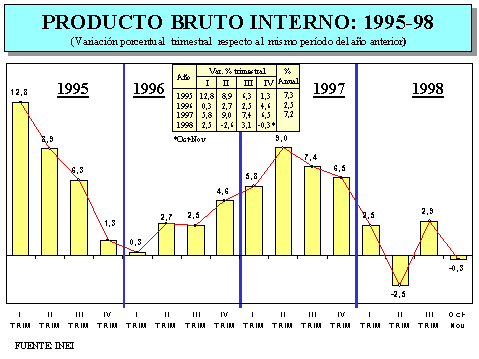 La tendencia trimestral del PBI, luego de experimentar una evolución decreciente desde el I trimestre de 1995, hasta alcanzar su punto mas bajo en el I trimestre de 1996, inició una recuperación alcanzando el punto mas alto el II trimestre de 1997, para luego experimentar una declinación, afectado por factores como el fenómeno de El Niño y la Crisis Asiática, que alcanzan su mayor impacto en el segundo trimestre de 1998. Sin embargo, en el tercer trimestre, se aprecia una recuperación, obteniéndose un resultado positivo de 2,9%, pese a que el promedio del PBI, de octubre y noviembre de 1998 experimenta una ligera disminución de -0,3%, la economía peruana estaría cerrando el año favorablemente, por sexto año consecutivo. ;
