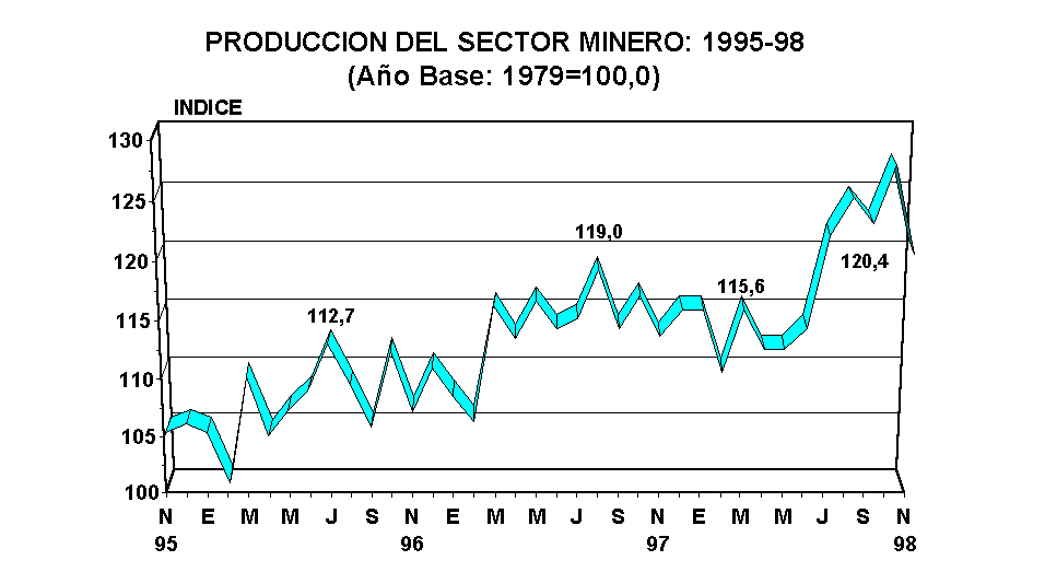 Durante los primeros once meses del año 1998, el sector minero aumentó en 3,7%, la actividad minera metálica creció en 5,4% influenciado por la mayor producción de hierro (13,0%) y oro (19,9%), mientras que la extracción de hidrocarburos aumentó ligeramente en 0,3%, como resultado de la mayor extracción de petróleo y gas natural en los últimos meses.