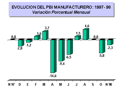 En noviembre de 1998 la actividad manufacturera registró una contracción de -2,3% en su nivel productivo, respecto a similar mes del año 1997, debido a la menor producción de Minerales no Metálicos (-12,8%), Textiles, Confecciones y Cuero (-10,8%), Papel, Imprenta e Editoriales (-10,3%), Metálica y Maquinaria (-10,0%), Manufacturas Diversas (-20,1%), Alimentos, Bebidas y Tabaco (-2,1%) y, Sustancias y Productos Químicos (-0,4%). Esta situación fue parcialmente atenuada por el comportamiento favorable que mostraron las industrias de Harina y Aceite de Pescado y Metálica Básica que crecieron en 16,6% y 2,5%, respectivamente.