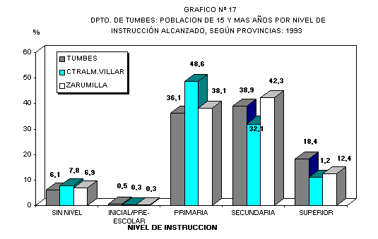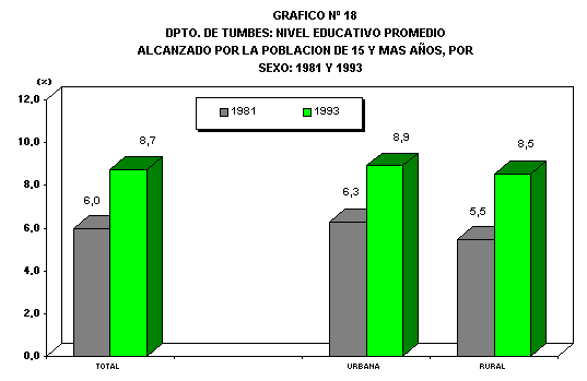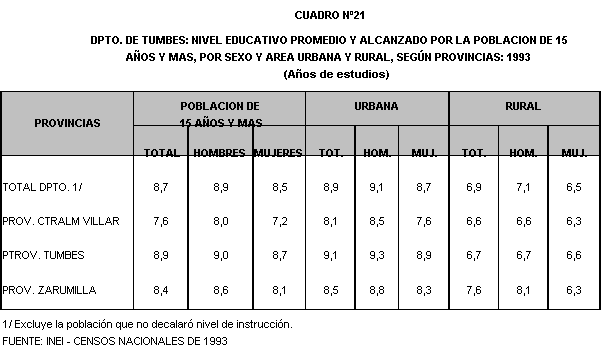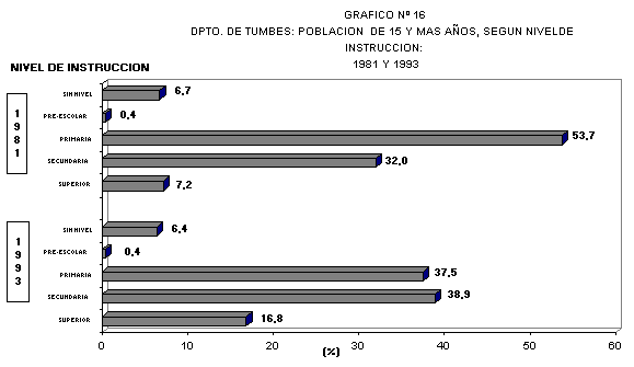 Los datos censales de 1993 están demostrando que el nivel educativo de la población de Tumbes, ha experimentado un notable incremento respecto a 1981, al haber aumentado la población con educación secundaria y superior. En efecto, el 55,7% de la población de 15 y más años de edad ha logrado superar la educación primaria completa. En 1981 esta proporción fue de 39,2%. Con relación a la educación superior, en 1993 el 16,8% de la población ha alcanzado este nivel, muy superior al observado en 1981 que fue de 7,2%.