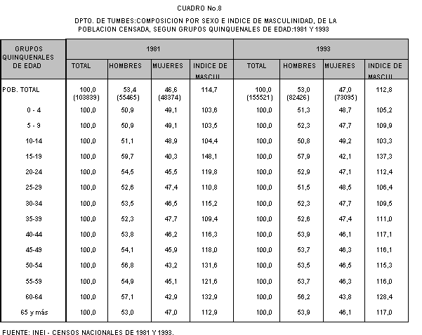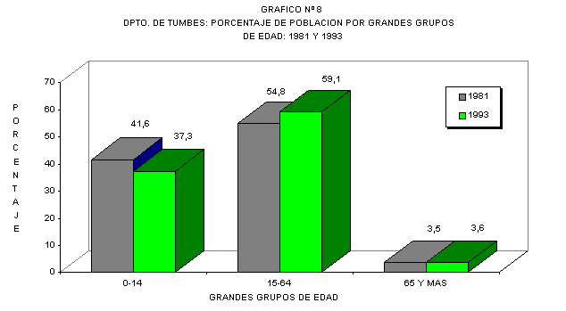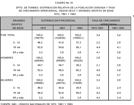 La población del departamento de Tumbes se caracteriza por ser relativamente joven, más de la tercera parte de la población (37,3%) es menor de 15 años. Sin embargo, este porcentaje está disminuyendo con respecto a los censos anteriores. Así, los menores de 15 años que en 1972 representaban el 46,2% de la población total, llegaron a constituir el 41,6% en 1981.