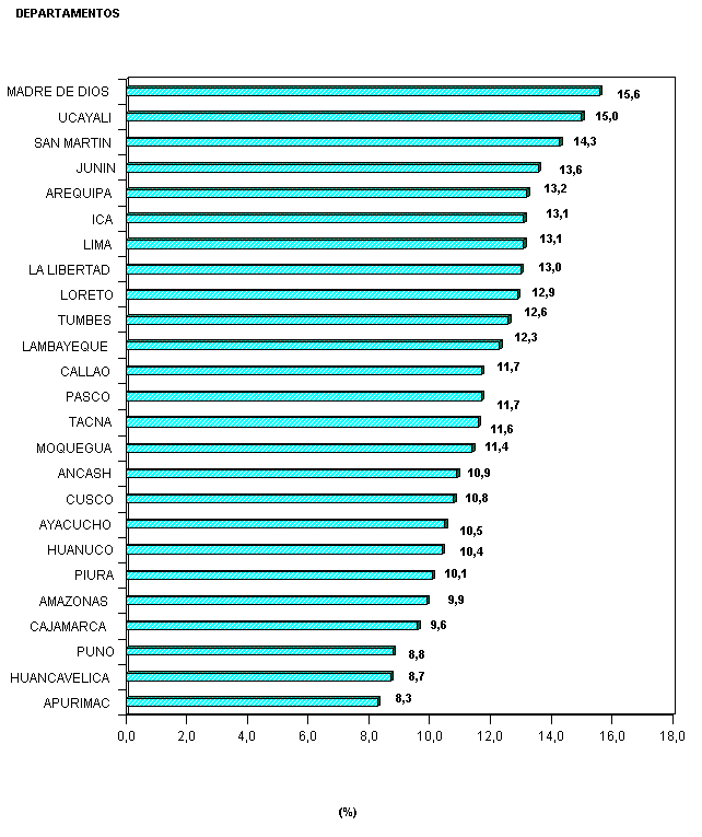A nivel departamental Madre de Dios, Ucayali, San MartRn, JunRn, Arequipa, Ica, Lima, La Libertad, Loreto, Tumbes y Lambayeque superan el promedio nacional.