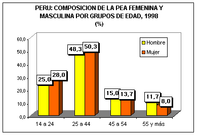 Como lo expresan las cifras presentadas, la tendencia al mayor incremento de la participación femenina se ha acentuado especialmente en el grupo de las mujeres jóvenes y de edades intermedias. Al analizar la composición de la PEA urbana por grupos de edad, se aprecia que en los grupos de edad de 14-24 años y de 25-44 años, participan ligeramente más mujeres que hombres en términos relativos. La participación de las primeras es de 28,0% y 50,3% y de 25% y 48,3% de los hombres respectivamente. ![]()