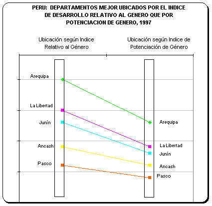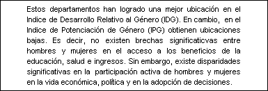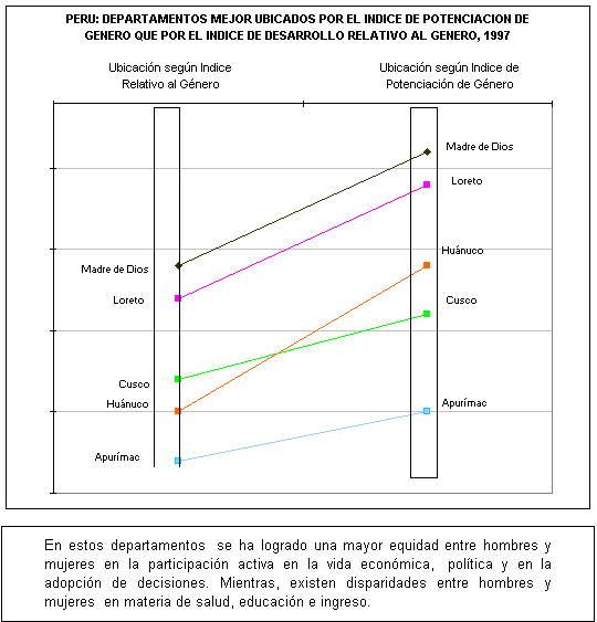 Asimismo, ningún departamento tiene un IPG igual o superior de 0,800. Sólo cuatro departamentos tienen un IPG superior a 0,500. La mayoría de los departamentos del país (quince) tienen un IPG entre los rangos de 0,500 y 0,400. En seis departamentos los valores del IPG se ubican por debajo de 0,400. La Provincia Constitucional del Callao y el departamento de Lima clasifican en los primeros lugares según el IPG, y les siguen a cierta distancia Tacna y Madre de Dios. Esto significa que en estos departamentos no sólo se ha avanzado en la capacidad básica de la mujer, sino que además se han abierto oportunidades para que las mujeres participen en las esferas económica y política. Según la clasificación del IPG, se encuentra que algunos departamentos de la selva (Madre de Dios, Loreto, Tumbes y Ucayali) que superan en cuanto a la igualdad de género en las actividades económicas y políticas a otros departamentos más desarrollados ubicados en la costa (Arequipa, La Libertad, Piura, Lambayeque). Esto demuestra que la creación de oportunidades para las mujeres no depende necesariamente del nivel de ingreso ni del nivel de desarrollo alcanzado.
