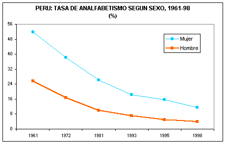4.2 Situación educativa de mujeres y hombres en la década de los noventa Analfabetismo La sociedad actual, provista de abundantes conocimientos e información, tiene en la lecto-escritura uno de los instrumentos básicos para acceder a ellos, siendo además el primer peldaño del camino prolongado del aprendizaje que se desarrolla a través de la vida. Por ello el analfabetismo, al imposibilitar el acceso a los conocimientos modernos, dificulta también muchas de las relaciones cotidianas, así como el ejercicio pleno de la ciudadanía, constituyéndose por ello una de las peores maneras de estar socialmente excluido. Entre las diversas políticas desarrolladas desde mediados de siglo - mantenidas de manera sostenida en el tiempo hasta la actualidad - y que han contribuido decididamente al descenso del analfabetismo, destacan dos por su importancia. Por una parte, la política de alfabetización adulta, que ha tenido especial énfasis en el área rural, como también en las zonas urbano-marginales. Otra política fundamental ha sido la ampliación de la cobertura de la educación básica y su marcha decidida hacia la universalización, ya que permitió la desacelaración del ingreso de nuevos contingentes a la población analfabeta. La combinación de ambas políticas permitió que el analfabetismo adulto presente un marcado descenso, al pasar de 38,9% en 1961 a 7,7% en 1998. ya que luego de afectar a cerca del 40% de la población a inicios de la década de los sesenta, en la antesala del nuevo milenio desciende hasta el 7,7%.