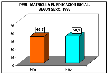 De acuerdo a información obtenida para el año 1998, la participación en la matrícula inicial según sexo se muestra casi paritaria. Así, del total de matriculados, el 50,3% son niños mientras el 49,7% son niñas. ![]()