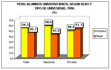 En el Perú, la educación superior universitaria y no universitaria ha experimentado una rápida expansión en las últimas décadas y la incorporación de las mujeres a este nivel ha ido en aumento e incluso superado a la de los hombres, como es el caso de la matrícula en educación superior no universitaria, donde de cada 100 matriculados 57 son mujeres. Asimismo, las mujeres culminan en mayor proporción que los varones sus estudios superiores no universitarios. Del total de personas que cursan el décimo grado, el 74,0% son mujeres. POR SEXO, 1998