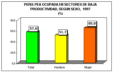 La inserción de las mujeres en el mercado laboral se realiza con características de segregación y desigualdad. Los hombres generalmente obtienen mayores ingresos y tienden a desempeñar los puestos de mayor jerarquía. La existencia de la segmentación ocupacional según género en el mercado de trabajo se expresa en la concentración de las mujeres en un conjunto de ocupaciones que se definen como típicamente femeninas en términos culturales. A ello se agrega la concentración femenina en puestos de menor jerarquía, lo que significa que son puestos de trabajo con menor remuneración y mayor inestabilidad. Así, el 21,0% de las mujeres trabajan en el comercio al por menor, frente a sólo 7,5% de los hombres. En cambio, los hombres trabajan como conductores de vehículos, albañiles, estibadores, peones agrícolas, agricultores, entre otros. Otro aspecto saltante de la inserción femenina es su alta participación en empleos domésticos. Las mujeres prácticamente son las únicas que trabajan como empleadas domésticas (14,3%), en tanto los hombres sólo participan con el 1,1%. El 14,3% de las mujeres que manifestó estar ocupados, trabaja como ambulante, mientras que sólo el 5,6% de los hombres se desempeña en esta ocupación. EN SU ACTIVIDAD PRINCIPAL, 1995, 1998 (Estructura ocupacional)