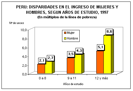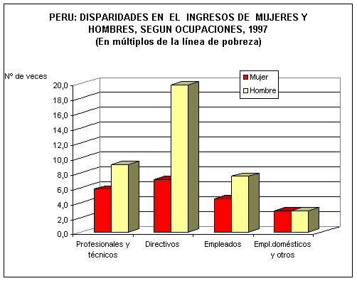 Observando la información sobre ingresos percibidos por mujeres y hombres que laboran en distintas ocupaciones más de 20 horas semanales, se aprecia que la disparidad en los ingresos se produce en casi la totalidad de actividades laborales y en los distintos niveles educativos, con la sola excepción de los trabajadores domésticos, mozos y guardianes, donde los ingresos son iguales para ambos géneros. La mayor diferencia se aprecia en los niveles directivos, en el cual las mujeres perciben en promedio 7,1 veces la línea de pobreza3/, mientras que los hombres perciben 19,8 veces la misma, es decir, los hombres perciben casi el triple lo percibido por las mujeres. En los grupos que han logrado menos de ocho años de estudio y entre nueve y once años de estudio, se observa que las disparidades presentadas son relativamente similares, aunque levemente mayor en el primer grupo analizado. Las mayores disparidades se presentan en el grupo de mayor logro educativo, ya que los hombres que han alcanzado 12 o más años de estudio, tienen ingresos en promedio 8,6 veces la línea de pobreza, mientras las mujeres alcanzan 5,1 veces la misma línea. En este grupo, la mayor disparidad se presenta en los obreros de transporte y almacenaje, en el cual los hombres perciben 5,1 veces la línea de pobreza mientras las mujeres perciben 1,5 veces4/. También los hombres que ejercen cargos directivos, profesionales y técnicos, y empleados administrativos y contables y que cuentan con 12 y más años de estudio presentan importantes diferencias con las mujeres que desempeñan cargos similares y que tienen los mismos años de estudios.
