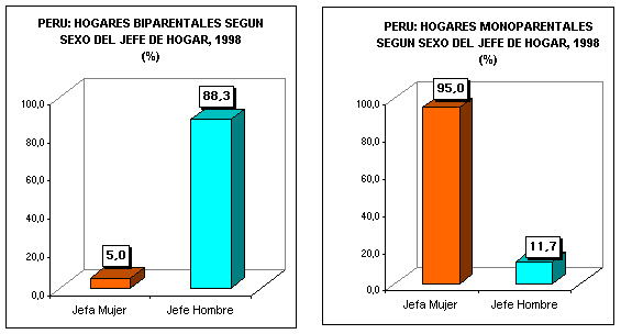 Las mujeres peruanas jefas de hogar constituyen un conjunto heterogéneo ya que incluyen a todos los grupos generacionales y estados conyugales que enfrentan a un conjunto de circunstancias diferentes. En medio de esta heterogeneidad la mayoría se caracteriza por conducir su hogar sin la presencia del cónyuge, por ello el presente estudio orienta su análisis hacia los hogares monoparentales conducidos tanto por mujeres como por hombres. ![]()