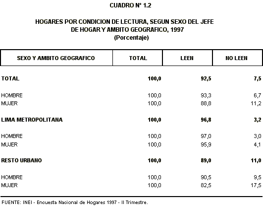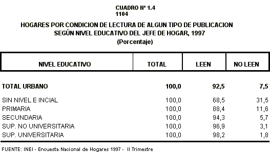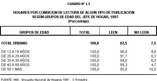 Por grupos de edad del jefe de hogar, el 95,3% de aquellos que tienen entre 40 y 49 años y el 94,0% de los de 30 a 39 años, manifestaron que en su hogar se habían leído publicaciones en los últimos tres meses. Entre los jefes de hogar de 50 y más años se encontró un 10,0% que dijeron que no se había leído en sus hogares.