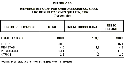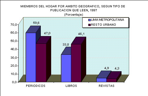 En Lima Metropolitana se aprecia un mayor porcentaje de lectores de periódicos, 59,6%. En el Resto urbano, se encuentran proporciones similares en los periódicos y revistas (47,0% y 46,1% respectivamente), por lo que parecería que la lectura corresponde a libros de texto de cada uno de los niveles educativos correspondientes.