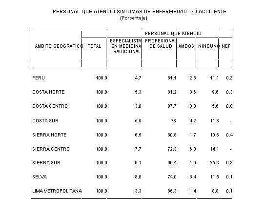 6. En Lima Metropolitana el 33% de jefes de hogar entrevistados respondió que acudieron a especialistas en medicina tradicional, el 86,3% a profesionales de la salud, el 1,4% manifestó haber consultado en forma simultánea a especialistas en medicina tradicional y profesionales de la salud. Un 8,8% respondió que no realizó consulta.