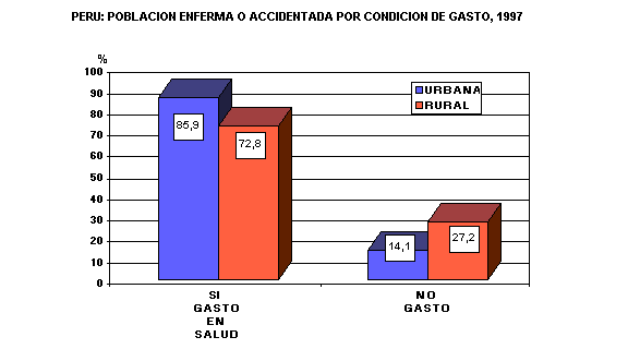 Según los resultados de la Encuesta Nacional de Hogares de 1997, el 81,5% de las personas entrevistadas que manifestaron haber padecido de alguna enfermedad o accidente, realizaron gastos en materia de salud, es decir, gastaron en consulta, medicinas, análisis, rayos x, exámenes médicos, etc. En cambio, el 18,5% de los entrevistados que reportaron haber padecido alguna enfermedad o accidente no gastaron.