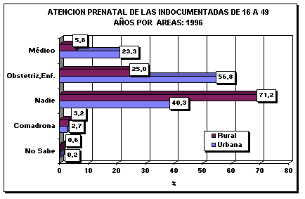 Se observa que en el área urbana hay un mejor nivel de atención prenatal de madres indocumentadas por profesional de la salud, llegando al 56,8%, de ellas, el 23,3% recurren a un médico y el 33,5% a una obstetriz o enfermera (23,5%), a diferencia de madres del área rural, donde la brecha es grande, representando el 25,0% de madres que solicitan los servicios profesionales de la salud, ya que 3 de cada 10 indocumentadas solicitan los servicios profesionales de la salud.