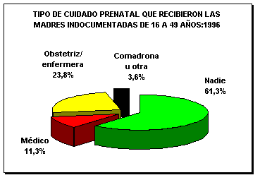 Las respuestas a estas preguntas dio como resultado que el 61,3% de las mujeres indocumentadas, es decir, más de la mitad de los nacimientos no recibieron ningún cuidado prenatal. El 23,8% mereció la atención de enfermeras u obstetrIces, el 11,3% ha tenido algún tipo de cuidado prenatal médico, es decir, que el cuidado del ambarazo llega a un 35,1%, lo que nos demuestra que la salud de la mujer está condicionado principalmente a factores sociales.