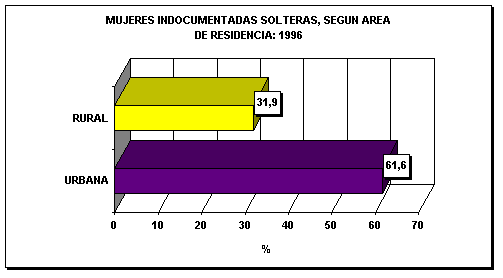 La distribución de las mujeres indocumentadas por área de residencia indica, que en el área rural el 36,8% están en estado de convivencia, en cambio, en el área urbana son las mujeres solteras indocumentadas, las que tienen el mayor porcentaje, llegando a 61,6%.