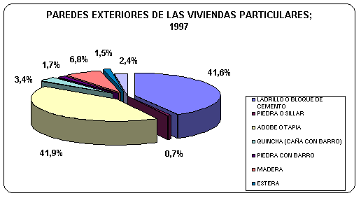 El material con el cual está construida la vivienda, es un indicador importante de las condiciones de vida de la población. 3.1 MATERIAL PREDOMINANTE EN LAS PAREDES EXTERIORES DE LAS VIVIENDAS PARTICULARES A nivel nacional el 41,9% de las viviendas particulares tienen paredes exteriores de adobe o tapia, una proporción similar de ladrillo o bloque de cemento, el 6,8% de madera, el 3,4% de quincha y el 6,3% de estera, piedra con barro, piedra o sillar, entre otros materiales. ![]()