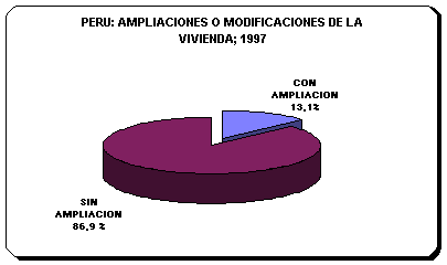 La ENAHO 97, muestra que por área de residencia la mayor proporción de hogares que realizaron ampliaciones o modificaciones en su vivienda se encuentra en el área urbana (15,1%), mientras que en el área rural esta representa el 9,6%. Según región natural, el 16,8% de los hogares residentes en la Selva hicieron ampliaciones o modificaciones en su vivienda, mientras que en la Sierra los hogares que realizaron alguna modificación o ampliación en sus viviendas representa el 9,9%, proporción más baja que el promedio nacional en 3,2 puntos porcentuales.