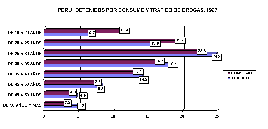 PERU: DETENIDOS POR CONSUMO Y TRAFICO DE DROGAS, SEGUN EDAD, 1996-97