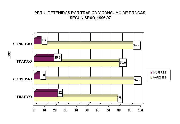 PERU: DETENIDOS POR TRAFICO Y CONSUMO DE DROGAS, SEGUN SEXO, 1996-97