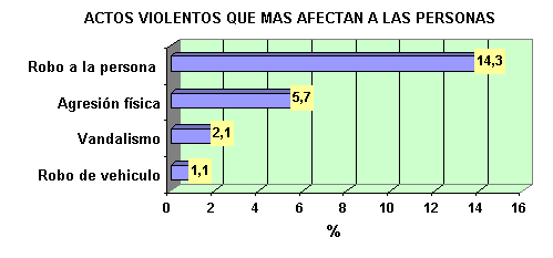 Con referencia a la proporción de personas que fueron afectadas por actos violentos, se encontró que el 14,3% de ellas habían sido afectadas por robos y el 12,1% por intento de robo. La agresión física la declararon el 5,7% de personas entrevistadas y el 2,1% informaron que habían sufrido algún acto de vandalismo. La cifras también revelaron que al 16,4% de personas que poseían vehículo particular, habían intentado robárselo y en el caso del 1,1%, el robo se había efectivizado.