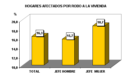 Las diferencias por área de residencia, muestran que es el área rural la más desprotegida contra robos a las viviendas pues alli casi una quinta parte, 19,3%, ha sido afectada por robo, en tanto que en el área urbana, las viviendas afectadas representan el 14,7%.