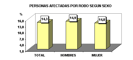 En cuanto a la población afectada, el 14,3% de las personas residentes en viviendas particulares, sufrieron robos fuera del hogar, siendo el porcentaje bastante similar tanto para informantes varones como para mujeres, 14,9% y 14,0%, respectivamente. Respecto a la frecuencia de ocurrencia de estos actos violentos, al 65,5% de los afectados les ocurrió solo una vez, al 22,1% les ocurrió dos veces y al 12,2% tres y más veces. CUADRO Nº 3.2 PERU: PERSONAS AFECTADAS POR ROBO, SEGÚN SEXO