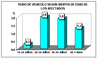 Cuando se observa la incidencia de robos de vehículo o autopartes según la edad de los entrevistados, los resultados muestran que los adulto jóvenes, es decir, aquellos que tienen entre 25 y 34 años, con 2,0%, son las víctimas preferentes de este tipo de actos violentos. Los menos afectados son los jóvenes entre 14 y 24 años de edad, con 0,3%. CUADRO Nº 4.4 PERU: ROBO DE VEHICULO, SEGÚN GRUPOS DE EDAD