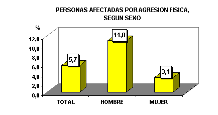 La encuesta reveló que en 1998, el 6,4% de los hogares a nivel nacional, tuvieron entre sus miembros, alguna víctima de agresión física. Este acto de violencia afectó a los hogares 1,5 veces en 1998. En Derecho, la agresión física es el ataque, el acontecimiento dirigido violentamente contra una persona para causarle algún daño, para herirla o matarla.