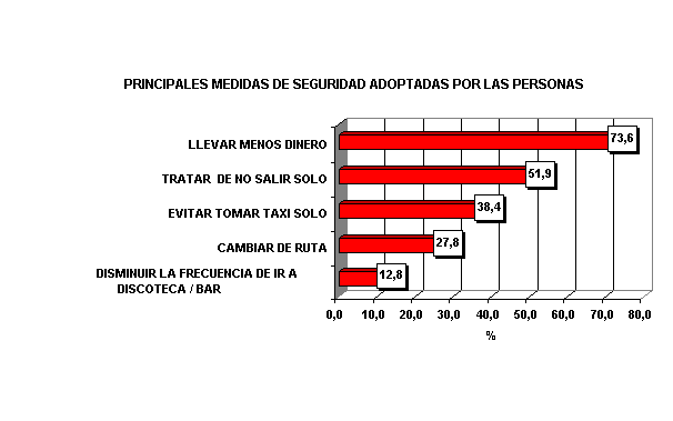 Casi tres cuartas partes de los entrevistados, 73,6%, optaron por llevar menos dinero consigo para evitar los robos callejeros, el 51,9% dijeron que evitaban salir solos, el 38,4% señalaron que evitaban tomar taxi cuando estaban solos, el 27,8% dijeron que trataban de protegerse de los robos cambiando de ruta, y el 12,8% indicaron que habían disminuído la frecuencia de ir a discotecas/bares.