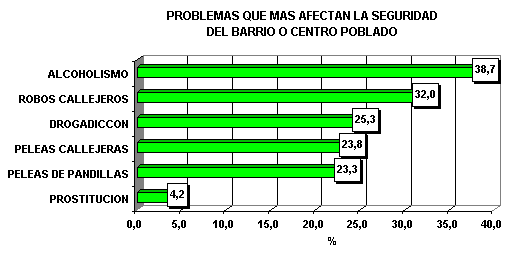 Los resultados de la encuesta indican que en opinión del 38,7% los entrevistados, el alcoholismo es el problema que más afecta la seguridad de su lugar de residencia, el 32,0% señaló que el problema eran los robos callejeros, el 25,3% indicaron que era la drogadicción, el 23,8% que las peleas callejeras y el 23,3% opinan que las peleas de pandillas. Hubo un 20,2% de entrevistados que opinan que no hay ningún problema de seguridad en el lugar donde viven. CUADRO Nº 9.6 PERU: PROBLEMAS QUE MAS AFECTAN LA SEGURIDAD DEL BARRIO