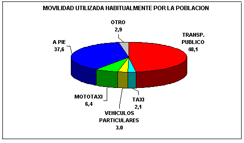 Alrededor de la mitad de la población entrevistada, 48,1% se moviliza en transporte público, el 37,6% se traslada a pie, el 6,4% en mototaxi y el 3,0% en vehículos particulares. El transporte público es un servicio mayormente utilizado en las áreas urbanas, el 78,8% de los residentes en Lima lo utilizan, así como el 46,2% de los residentes en la costa y el 29,2% de aquellos que viven en la sierra. Por el contrario en el área rural, casi tres cuartas partes de los entrevistados indicaron que se movilizan a pie, lo mismo señalaron el 63,8% de los residentes en la sierra y el 52,3% de los que viven en la selva. CUADRO Nº 10.1 PERU: TIPO DE MOVILIDAD UTILIZADA HABITUALMENTE PARA MOVILIZARSE,