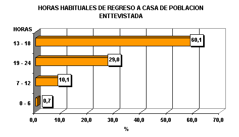 Con relación a las horas en que la población habitualmente regresa a sus casas, se encontró que el 60,1% lo hace entre las 13:00 y las 18:00 horas, el 29,0% de 19:00 a 24:00 horas y el 10,1% entre las 7 de la mañana y las 12 del mediodía. Según zona geográfica de residencia, se aprecia que en las partes urbanas del país la población suele regresar más tarde a sus casas, en Lima Metropolitana el 45,1%, y en la costa el 32,4% llega después de las 19:00 horas. CUADRO Nº 10.4 PERU: HORAS HABITUALES DE REGRESO A CASA, SEGÚN AMBITO GEOGRAFICO