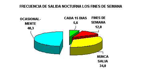 Casi la mitad de la población entrevistada, 48,3% manifestó que sólo ocasionalmente salía por las noches los fines de semana, el 34,0% indicaron que nunca salían, el 12,0% señalaron que salían todos los fines de semana y el 5,6% lo hace cada 15 días. Por ámbito geográfico, el porcentaje de salida por las noches es mayor en la costa, 18,9%, en cambio, la proporción de personas que declararon que nunca salían es mayor en la sierra con 52,2%, y en la selva con 37,8%. CUADRO Nº 10.5 PERU: FRECUENCIA DE SALIDA POR LAS NOCHES LOS FINES DE SEMANA,