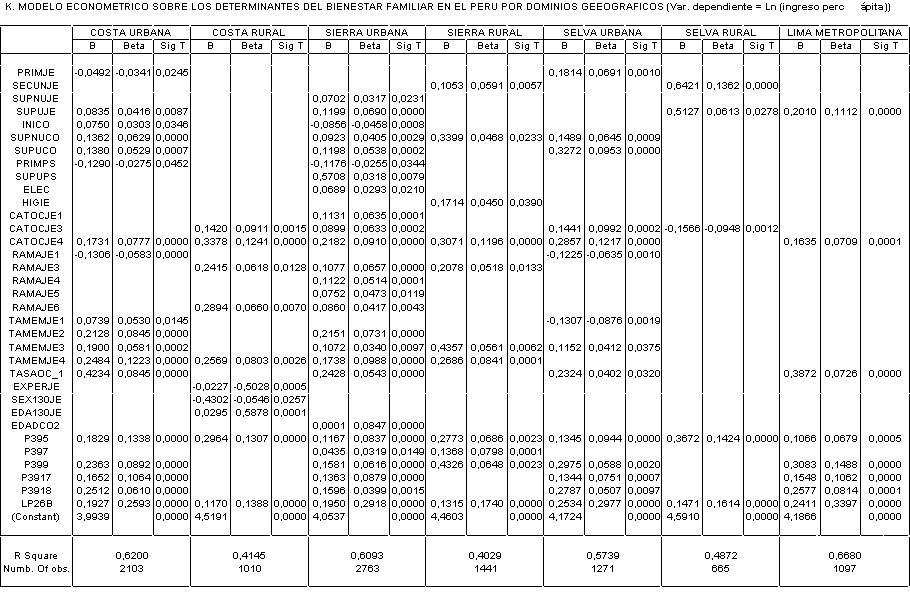 K. MODELO ECONOMETRICO SOBRE LOS DETERMINANTES DEL BIENESTAR FAMILIAR EN EL PERU POR DOMINIOS GEEOGRAFICOS (Var. dependiente = Ln (ingreso percápita)