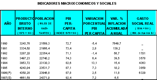 Al finalizar el año 1997, el contexto macroeconómico y social del Perú presenta significativos cambios cualitativos respecto al escenario observado antes del ajuste y cambio estructural. En efecto, durante este proceso se consolidaron las condiciones para la estabilización económica y social . Se ha logrado reducir la inflación de 7649.7 por ciento en 1990 a 6.5 por ciento en 1997, en tanto que el PBI per capita continúa creciendo desde el año 1993 a tasas superiores al crecimiento poblacional. La recuperación económica expresada en las tasas de crecimiento del PBI y la disminución de la inflación, han tenido impactos importantes sobre los niveles de vida de la población.