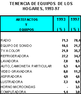 La tenencia de equipos y de bienes duraderos en el hogar constituye un indicador de la capacidad de compra o niveles de consumo de la población , por lo mismo tiene una estrecha vinculación con el nivel de ingresos. Siguiendo con este razonamiento, lo esperado en el país, dado el mayor nivel de bienestar, es encontrar una mayor tenencia de bienes duraderos en los hogares. En efecto, conforme lo indican los resultados obtenidos a partir de la ENAHO 97-IV, puede observarse un aumento significativo en la capacidad de los hogares para adquirir bienes o equipos duraderos entre los años 1993-97.