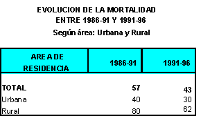 La mortalidad infantil, considerada como el indicador resumen de las condiciones de vida de la población, sensible a las condiciones socioeconómicas, muestra según puede apreciarse en el cuadro, que de cada mil niños que nacieron en el Perú durante 1991-96, 43 de ellos murieron antes de cumplir su primer año de vida. Lo que en relación a los estimados para 1981-86 evidencia una reducción de 25 Por ciento.