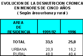 Este indicador como medida que relaciona la talla para la edad, entre los menores de cinco años, descendió en el último quinquenio, de 33.5 % a 25.8 %. Dicha reducción se ha dado con mayor énfasis en el área rural, donde descendió de 48.0% a 40.4 % . En tanto que en el área urbana el descenso fue menor, conforme indica el cuadro.