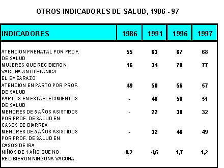 Adicionalmente, es de mencionar la evolución encontrada en otros indicadores, como por ejemplo la atención en general por profesionales de salud, destacando entre ellos la atención prenatal . En efecto, según la información disponible el 68 por ciento de los nacimientos ocurridos en los últimos años recibió asistencia prenatal de profesionales de salud . La atención prenatal se ha incrementado en cinco puntos porcentuales respecto a lo observado en 1991. Asimismo en la perspectiva de reducir la morbi-mortalidad infantil se encontró que el 77 por ciento de los niños menores de cinco años recibió protección contra el tétano neonatal mientras la madre estaba embarazada, evidenciándose un incremento significativo en el nivel de inmunización respecto al año 1991, en el que sólo el 34 por ciento de los niños estaba protegido.