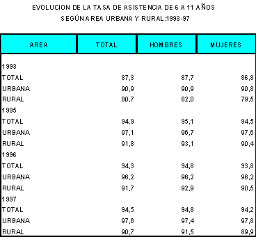 La mejora favorable en las condiciones de vida, se ha reflejado en la evolución de los principales indicadores educativos de acceso. Según puede apreciarse en el cuadro, la proporción de niños de 6 a 11 años que asisten a la escuela, ha evolucionado positivamente pasando de 87.3 por ciento en 1993 a 94.5 por ciento en 1997, no observándose diferencias entre sexos.