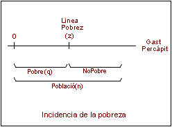 a.  El indicador de incidencia de la pobreza (extensión o prevalencia) es el más simple y más común, el cual esta dado por la proporción de la población cuyo gasto percápita es menor a la línea de pobreza. Si q es la cantidad de personas pobres, es decir, con ingresos menores a la línea, en una población de tamaño n, entonces la incidencia de la pobreza (H) será: H = q / n.