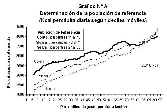 Asumiendo que el percentil que ingiere las 2318 kcal diarias es el que se encuentra en el lugar medio de dichos deciles, se seleccionó como población de referencia al 30 % contenida en los percentiles 11 al 40 para la Costa, 42 al 71 para la Sierra y 27 al 56 para la Selva (ver Gráfico Nš 5.1).