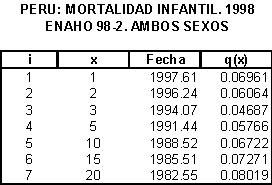 1. Estimación de la Mortalidad Infantil: Método de Brass El método se apoya en la información sobre el número de hijos nacidos vivos e hijos supervivientes declarados por las mujeres entrevistadas. Con esta información se calculan proporciones de hijos fallecidos por edad de la madre, las mismas que son indicadores de la mortalidad en los primeros años de vida. La técnica de Brass permite convertir las proporciones de hijos fallecidos en medidas más convencionales de la mortalidad, específicamente en probabilidades de morir entre el nacimiento y ciertas edades exactas, esto es posible si se considera que la proporción de hijos fallecidos de las mujeres de cierto grupo de edad depende de: a) El tiempo durante el cual estos niños han estado expuestos al riesgo de morir. b) Los riesgos de mortalidad a los cuales han estado expuestos. Inicialmente Brass plantea las siguientes relaciones apara calcular las tasas convencionales: Q(i) = 1 - HS(i)/HNV(i) Donde: Q(i), es la proporción de hijos fallecidos con respecto al total de los nacidos vivos, declarados por las mujeres del grupo de edad "i". HS(i), es el número de hijos sobrevivientes por mujer del grupo de edad "i". HNV(i), es el número de hijos nacidos vivos declarados por las mujeres del grupo de edad "i". La probabilidad de morir se define como: q(x) = k(i). Q(i) tal que x=1,2,3,5,10,.. Siendo k(i) un factor que permite transformar las proporciones de hijos fallecidos en probabilidades de morir. Posteriormente Coale y Trussell proponen derivar las k(i) sobre la base de modelos de fecundidad empíricos y las cuatro familias de mortalidad de Coale y Demeny, construyendo un modelo basado en técnicas de regresión. Adicionalmente este modelo permite determinar el tiempo "t" al que se refiere la estimación, medido en años antes de la realización de la encuesta. Los resultados de la aplicación de los datos de la ENAHO 98-2, en el ámbito nacional, correspondiente al modelo Oeste se presenta en el siguiente cuadro. Las probabilidades de morir al primer año aparecen en la última columna, en ellas se observa que no guarda la tendencia en ascenso, esperada, a medida que la fecha se aleja del día de la entrevista. Estos errores se atribuyen a factores de memoria de las madres que no declaran correctamente el número de hijos tenidos y los supervivientes. Como se observa en los datos, pareciera que las dos primeras probabilidades, o sea las más recientes, están fuera de serie. Para tener una estimación más consistente se plantea un ajuste de las probabilidades de morir sobre la base de una función logística y se toma la lectura para 1997, probabilidad que la consideramos como la tasa de mortalidad infantil para esa fecha.