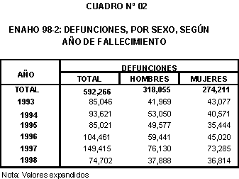 El Cuadro Nº 02 muestra el total de defunciones captadas por la encuesta en el período 1993 - 1998. De los datos anuales, se puede suponer que el factor memoria ha hecho que las defunciones para los años más lejanos de la serie estén subestimados, en tanto que para 1997 y 1998, años recientes, la información es más coherente con el número de muertes que se espera para esos años. En efecto, de acuerdo a las proyecciones oficiales1 las defunciones para estos años serían, en promedio 158 mil, en tanto que de acuerdo a la encuesta estarían alrededor de 150 mil. Se debe tomar en cuenta que en 1998 la encuesta registra muertes ocurridas para menos de la mitad del año, aproximadamente hasta las primeras semanas del mes de junio. Si consideramos como referencia las muertes de las proyecciones, se estaría atribuyendo a la encuesta cierto nivel de sub-enumeración de muertes, en todo caso mínimo en comparación con las que usualmente se manejan en los registros continuos.