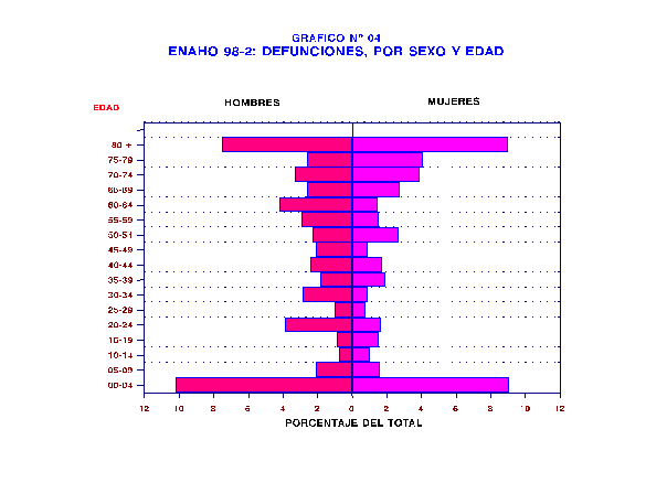 La siguiente figura (gráfico Nº 04) representa la distribución por edad y sexo de las defunciones captadas por la encuesta. Pese a tratarse de números absolutos, es decir no se han graficado tasas, en general se observa el cumplimiento de la sentencia demográfica de que la mayor frecuencia de muertes se agrupa en los extremos de la vida, en el lado más joven debido a la alta mortalidad de niños en tanto que en el otro extremo por la mortalidad en la vejez. No obstante las diferencias naturales existentes en la mortalidad según las edades, se notan los efectos de la mala declaración de la edad de los difuntos o tal vez de una omisión diferencial según la edad, en todo caso se deberá aplicar todas las técnicas necesarias para ajustar y corregir la distribución de la mortalidad según la edad sexo con la finalidad de construir las Tablas de Mortalidad, que es con lo que se espera concluir esta parte del estudio. |