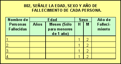 La ENAHO 98-2, en el Capítulo 800. Aspectos Demográficos, considera una forma práctica y sencilla para obtener información sobre la edad, sexo y año de fallecimiento de una o más personas en el hogar (ver Diagrama Nº 01), la que debería ser replicada en las próximas encuestas, sobre todo en el censo del 2000, para disponer de suficiente información para realizar estudios sobre la estructura por edad y sexo de la mortalidad. |