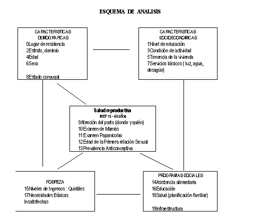Las variables que identifican las "condiciones de vida de la población", están conformadas por todas las características demográficas sociales y económicas de la población en general, y de los grupos poblacionales específicos (Costa, Sierra y Selva y Lima Metropolitana). El esquema de análisis utilizado establece las interrelaciones que se dan entre las variables demográficas, sociales y económicas con respecto a la situación de salud reproductiva y la pobreza. Estas dos últimas variables salud reproductiva y pobreza son dependientes de las primeras, así como interdependientes entre sí. Los "programas sociales" con sus cuatro componentes constituyen las variables externas de acción del gobierno tendientes a disminuir los índices de pobreza y aliviar la deficiente situación de salud, alimentación, educación e infraestructura básica. El estudio se interesó analizar el Programa de Planificación Familiar su conocimiento y beneficio en la población. El análisis realizado es primordialmente descriptivo - explicativo de las relaciones existentes entre las variables seleccionadas, mediante cuadros de 2 y 3 entradas. En todos los casos se trabajó con los datos expandidos, utilizando el factor Mi, definido por el INEI. También se utilizó el análisis de clasificación múltiple (MCA) y de varianza (ANOVA) para estimar el grado de correlación de los factores seleccionados (predictores) con cada uno de los indicadores de salud reproductiva.